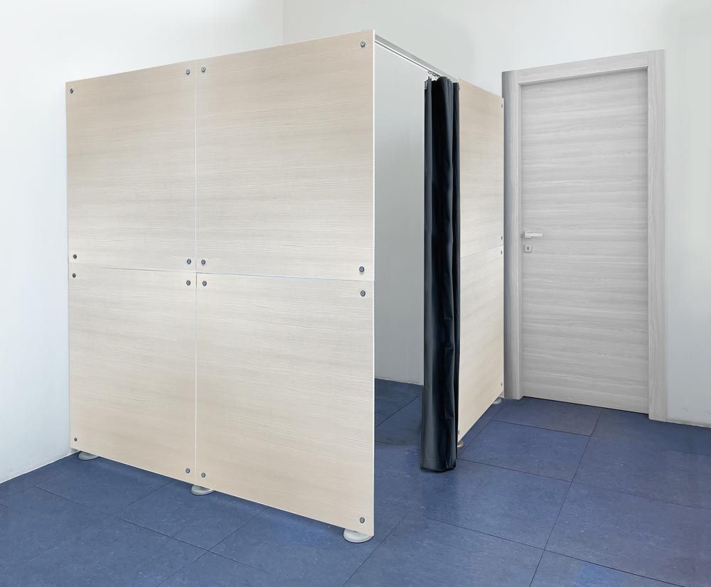 The configuration possibilities of the cabins are almost infinite: they can in fact be arranged "comb" in a narrow and elongated room; a corner of the room can be used to create an L-shaped cabin to be used, for example, as a deposit for bulkier equipment; if the room is large, self-supporting cabins can be added in the center of the room.